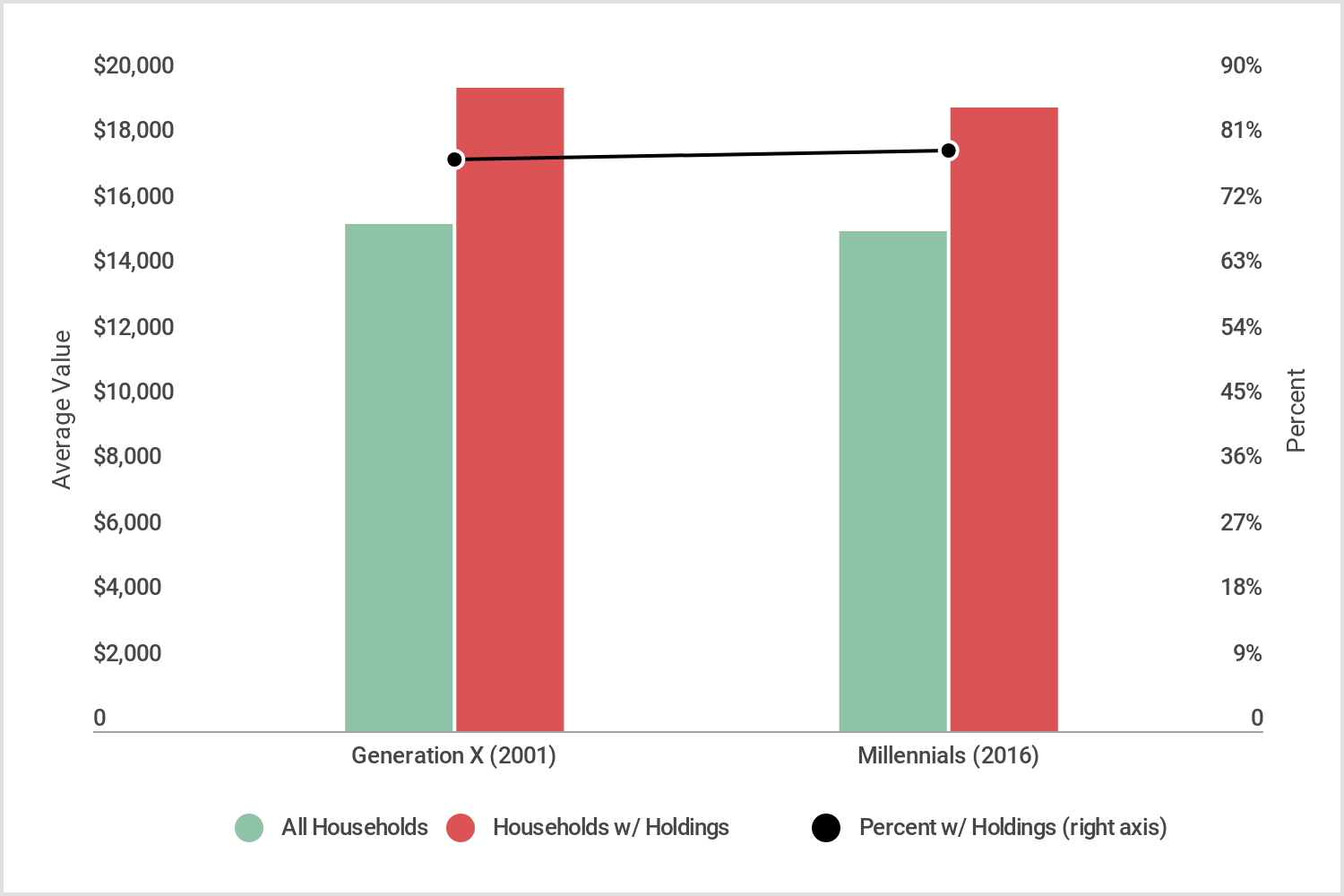 Vehicles were the most commonly held nonfinancial asset for both generations. This category is broad, covering everything from cars and RVs to boats, airplanes, and helicopters. Over 80 percent of millennial households owned a vehicle in 2016, a number that’s just slightly higher than the ownership rate among Generation X in 2001. Interestingly, while home prices (and their corresponding household asset values) have been increasing, the average value of vehicles stayed relatively consistent between 2001 and 2016.