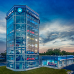 eight-story, all-glass tower that holds up to 30 vehicles, offering a