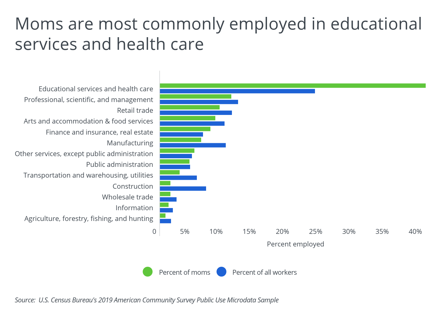 Working mothers are most commonly employed in the education, health care, and social assistance sectors, which account for approximately 23% of all workers, but over 40% of working moms. This industry group includes school teachers and nurses, which are some of the most common occupations for women. Working mothers are also overrepresented in the finance, insurance, and real estate sectors, but typically underrepresented in other fields.