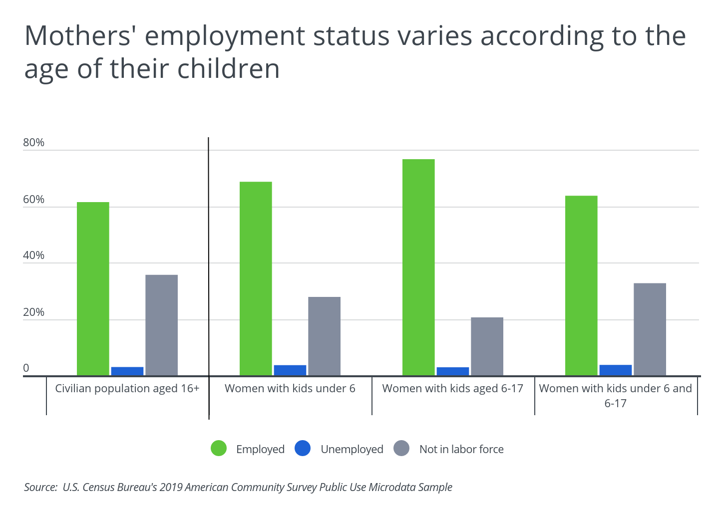 Nearly 72% of all moms are employed either full-time or part-time, which is higher than the overall level of 63% for the general population. However, the employment status and labor force participation rates of mothers depend on their children’s ages. Moms that have school-age kids only (aged 6-17) are the most likely to be employed, at nearly 77%. On the other hand, moms with both young children (under 6) and school-age kids have the lowest employment rate, at 64%. This group is also the least likely to be in the labor force, with one-third of these moms opting out.