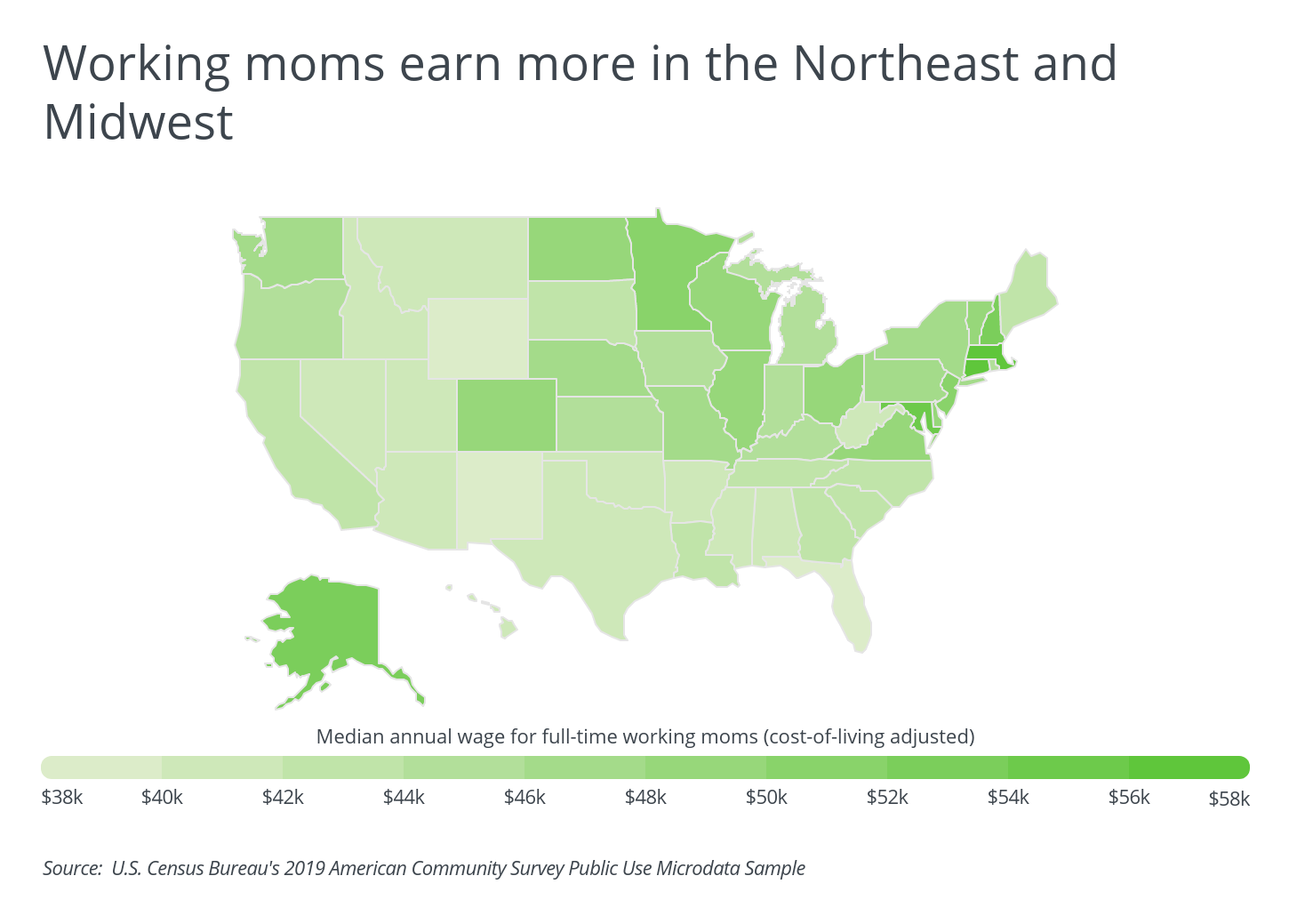 Despite living costs that tend to be higher than average, moms living in the Northeast are still well-paid compared to those in other parts of the country. Relatively low costs of living also mean that Midwestern moms fare well, even though wages in these states are not that much, if at all, higher than the national average. Out of all states, moms in Massachusetts and Connecticut earn the most after adjusting for cost of living. The median cost-of-living-adjusted annual wage for full-time working moms is $58,877 in Massachusetts and $57,143 in Connecticut. Conversely, Florida moms earn the least—median cost-of-living-adjusted earnings for full-time working moms is just $38,614 in the Sunshine State.