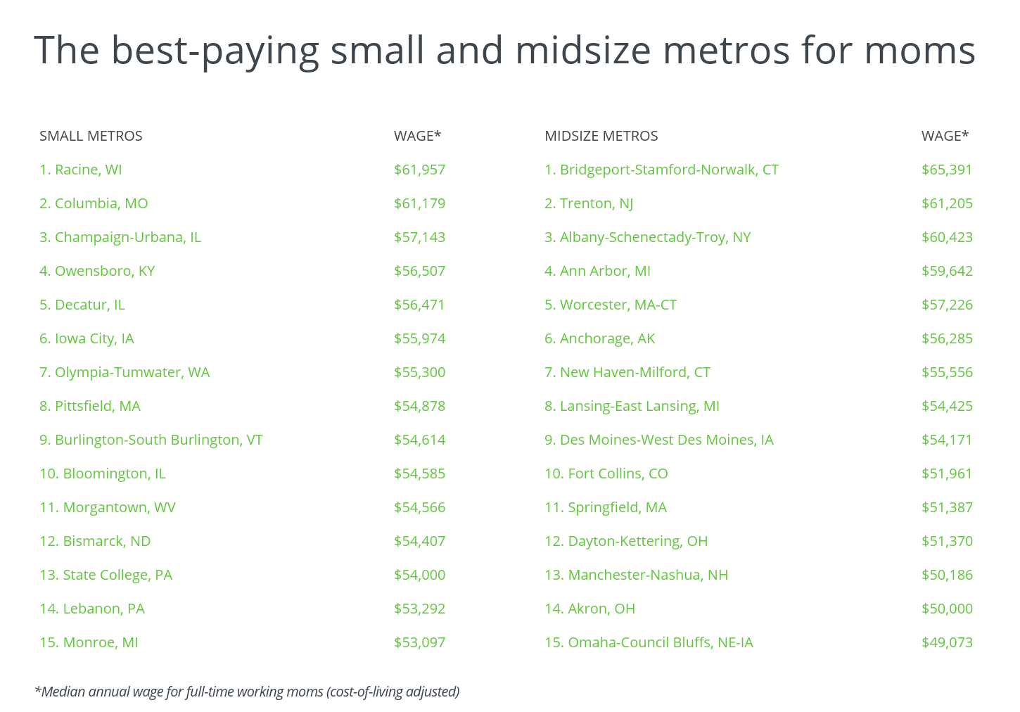 The best-paying locations for moms include expensive metros with high-paying jobs and well-educated workforces as well as more affordable Rust Belt areas. While the San Jose and San Francisco metros are the most expensive in the country, working moms earn enough there to make up for the high cost of living. At the same time, working moms in the Columbus, OH metro area earn much less, $50,000 at the median, but the relative affordability of Columbus means that their cost-of-living-adjusted wages are almost $55,000—nearly as much purchasing power as that held by working moms in San Francisco.