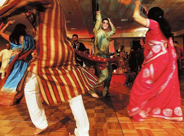 A Los Angeles-based dhol player keeps beat with the music on the Indian folk drum and the dance floor becomes a whorl of activity. Dancers clap and sing to the music while taking spinning steps that move the group around in a large circle. Later two lines of dancers, each person armed with a pair of dandiya sticks, tap the sticks behind their backs, in front of them and against their partner's sticks to the beat of the music.