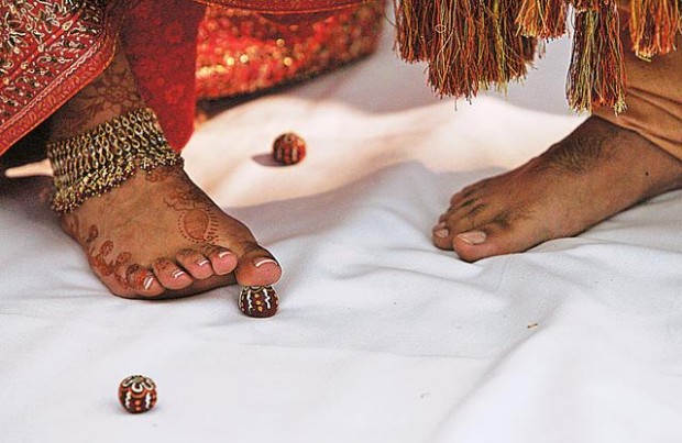 The 350 guests are dressed formally, with yards of flowing fabrics and glittering jewelry. Puneet, who simply wore a suit the night before, dons a red tunic with matching pants and scarf. Rachna appears in a lime green chaniya choli (short top and long flowing skirt) with delicate beadwork and metallic appliqué embroidery.