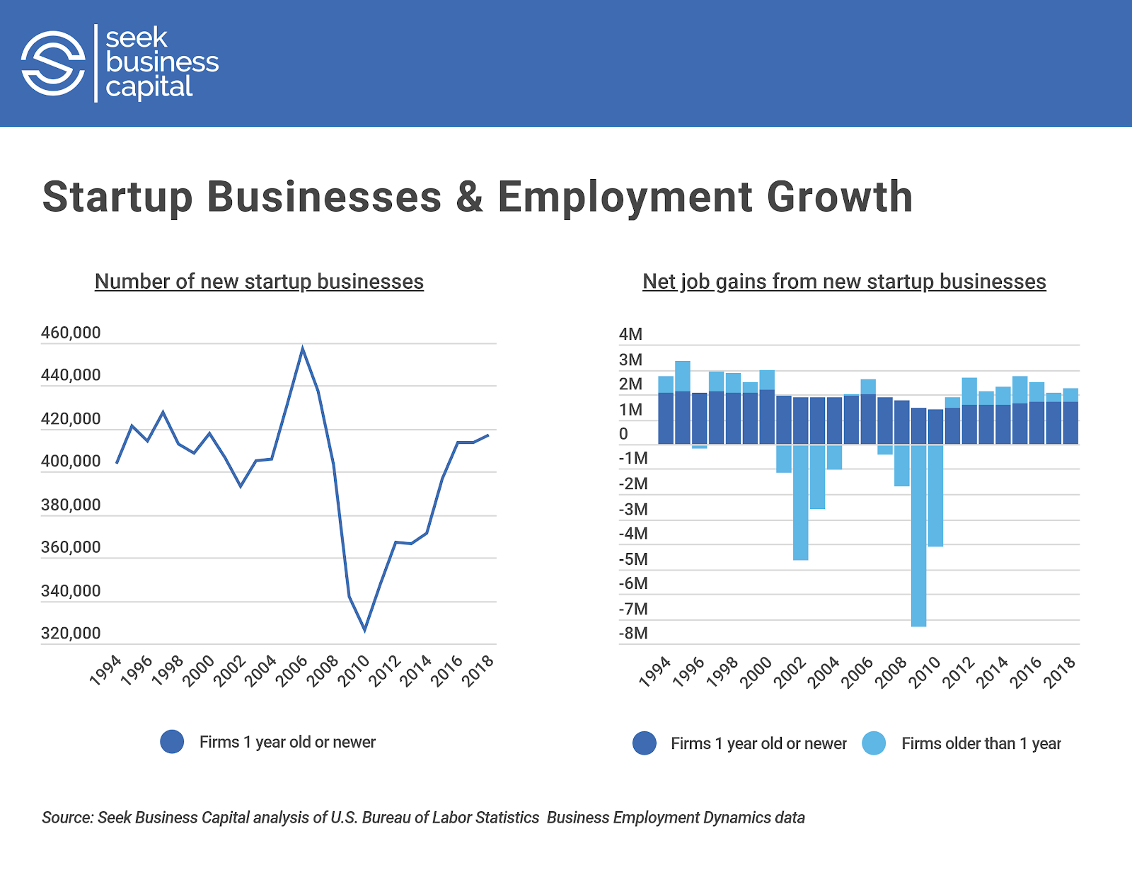 What’s less well-known is that while most startup businesses will never achieve scale, they do still play a vital role in creating jobs and driving the U.S. economy forward. According to the Bureau of Labor Statistics, more than 416,000 new firms opened in the year leading up to March of 2018, the largest number since the Great Recession. While new firms represent just a small proportion of total firms, job openings from these new businesses disproportionately impact employment figures. Between 2017 and 2018, for example, startup firms gained 1.7 million jobs, compared with a net gain of just 518,000 from older firms.