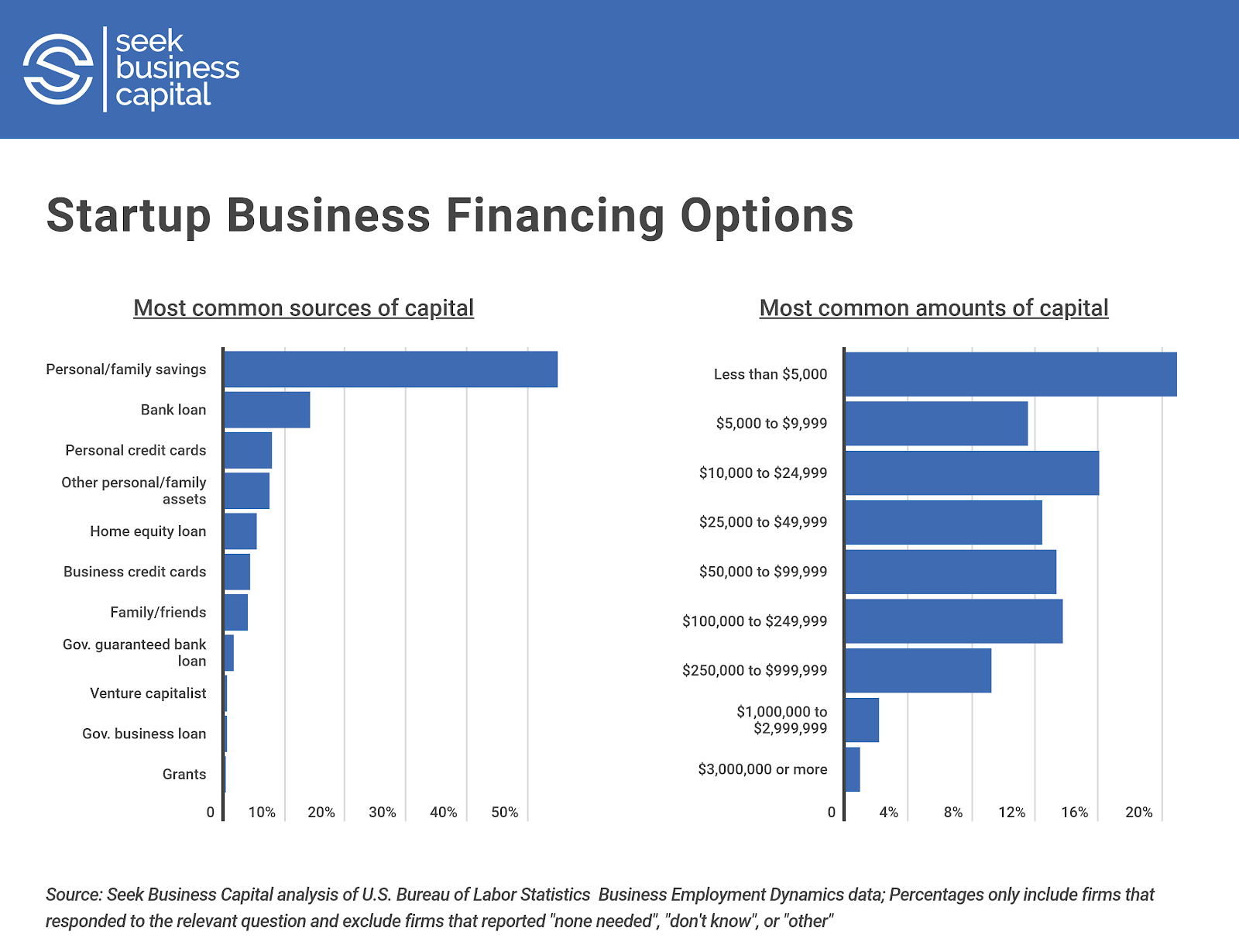 Starting a new business doesn’t come without risk. Just one in two establishments opened between March of 2012 and March of 2013 survived to March 2018. While businesses may close shop for a variety of reasons—such as selling the firm, lack of product-market fit, or poor team dynamics—a majority of owners cite lack of capital as the main reason for closing.