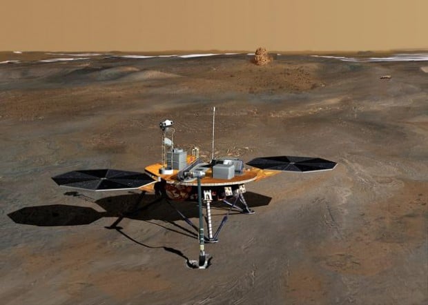 During the mission's three to five months of scientific work — before the pole is socked in by its winter layer of supercold CO2 "dry ice" — the lander's cameras, weather station, scientific ovens and wet laboratory will also analyze soil and study trenches dug by its robotic arm, photograph clouds and study winds.